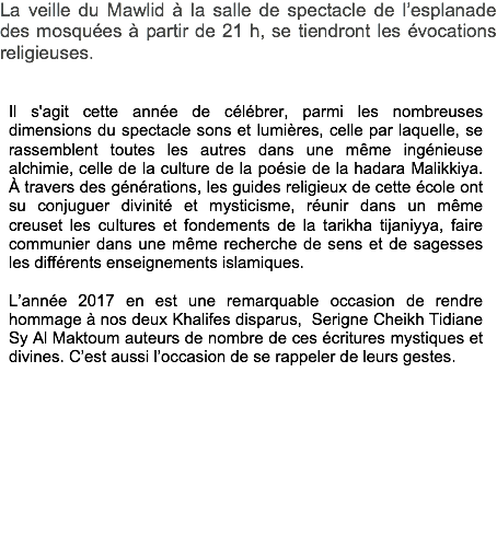 La veille du Mawlid à la salle de spectacle de l’esplanade des mosquées à partir de 21 h, se tiendront les évocations religieuses. Il s'agit cette année de célébrer, parmi les nombreuses dimensions du spectacle sons et lumières, celle par laquelle, se rassemblent toutes les autres dans une même ingénieuse alchimie, celle de la culture de la poésie de la hadara Malikkiya. À travers des générations, les guides religieux de cette école ont su conjuguer divinité et mysticisme, réunir dans un même creuset les cultures et fondements de la tarikha tijaniyya, faire communier dans une même recherche de sens et de sagesses les différents enseignements islamiques. L’année 2017 en est une remarquable occasion de rendre hommage à nos deux Khalifes disparus, Serigne Cheikh Tidiane Sy Al Maktoum auteurs de nombre de ces écritures mystiques et divines. C’est aussi l’occasion de se rappeler de leurs gestes.